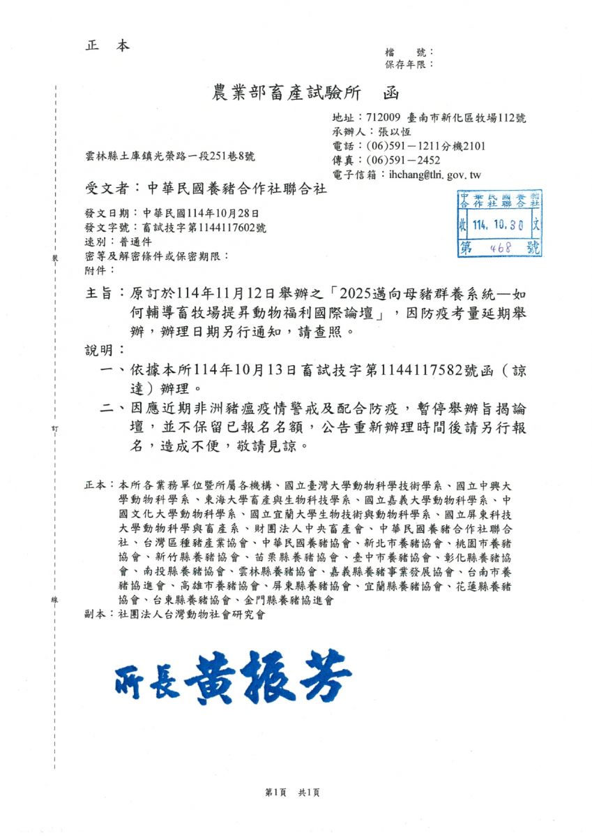 原訂於114年11月12日舉辦之「2025邁向母豬群養系統-如何輔導畜牧場提昇動物福利國際論壇」,因防疫考量延期舉辦,辦理日期另行通知