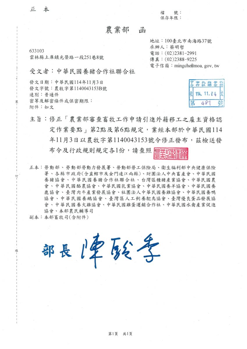 修正「農業部審查畜牧工作申請引進外籍移工之雇主資格認定作業要點」第2及6點規定