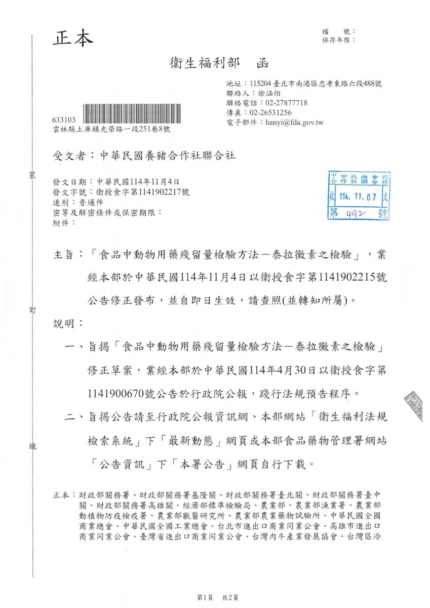 衛福部「食品中動物用藥殘留量檢驗方法-泰拉黴素之檢驗」公告修正發布