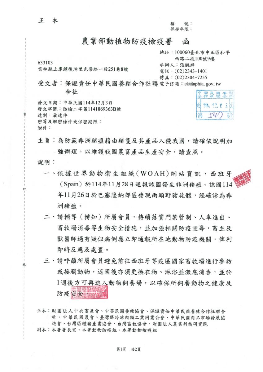 防檢署來函,西班牙於114年11月28日通報發生非洲豬瘟,為防範該疫病藉豬隻及其產品入侵,請依說明加強辦理