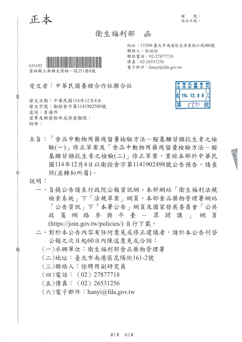 衛福部「食品中動物用藥殘留量檢驗方法-胺基醣苷類抗生素之檢驗(一)」及「食品中動物用藥殘留量檢驗方法-胺基醣苷類抗生素之檢驗(二)」修正草案