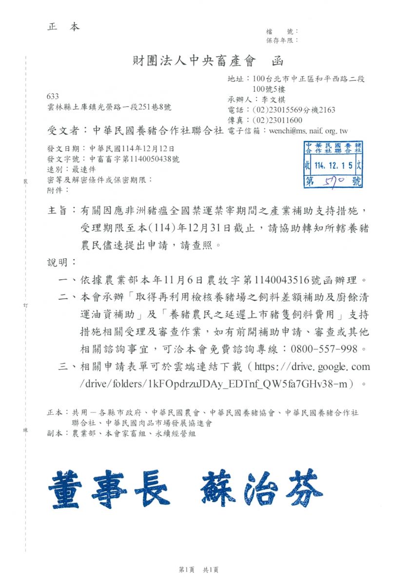 畜產會來函,有關禁運禁宰期間之產業補助支持措施,受理期間至本(114)年12月31日截止,請盡速提出申請