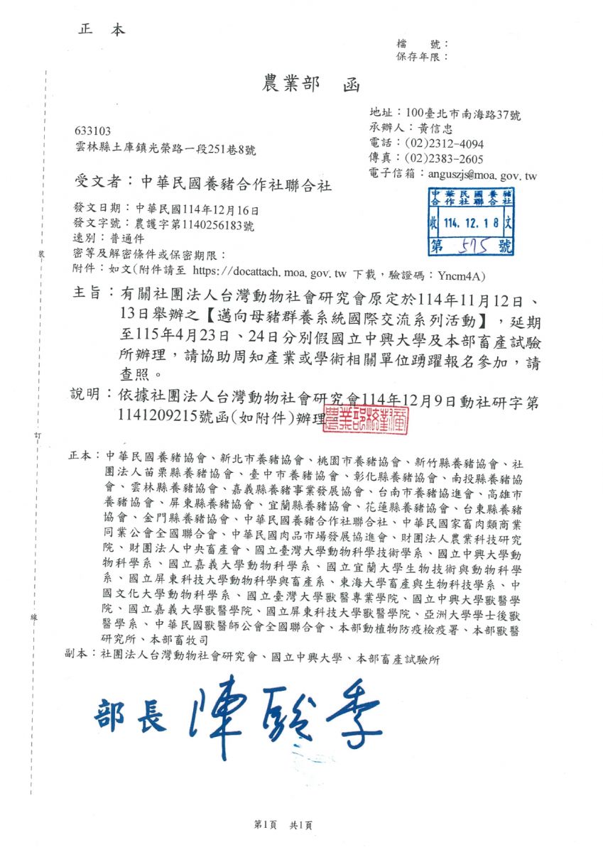 115年4月23日及24日舉辦「邁向母豬群養系統國際交流系列活動」活動資訊如下: (一)2026中興大學「母豬群養系統國際趨勢與轉型關鍵」工作坊 1、日期:115年 4月23 日(四)13:30~17:00 2、地點:中興大學動物科學系407視聽教室(台中市南區興大路145號) 3、報名:現場參與80人 4、報名連結:https://neti.cc/X7omLvk (二)2026「邁向母豬群養系統—如何輔導畜牧場提昇動物福利」國際論壇 1、日期:115年 4月24日(五)09:30~16:30 2、地點:農業部畜產試驗所視聽室(台南市新化區牧場112號) 3、報名:現場參與限額120人,皆須事前報名。 (1)報名現場出席:https://neti.cc/GR9go45 (2)報名線上參與:https://neti.cc/xOvBPYg ![]() |