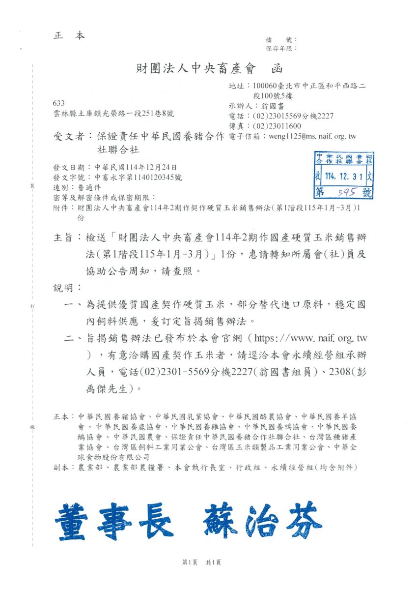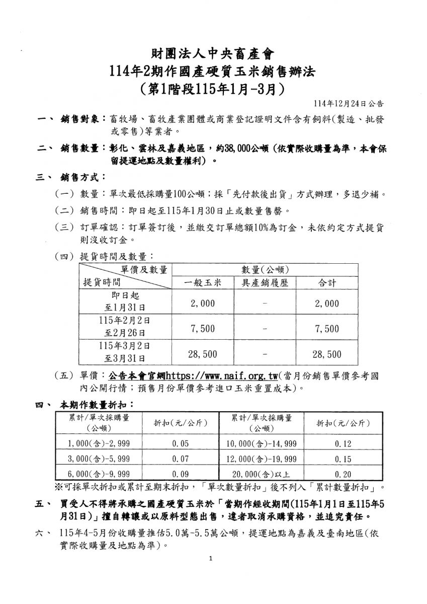 財團法人中央畜產會「114年2期作國產硬質玉米銷售辦法(第1階段115年1月-3月)」1份