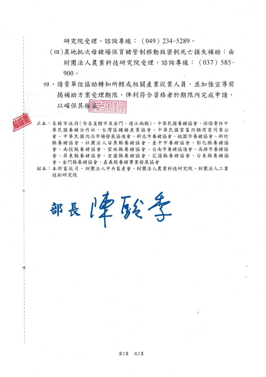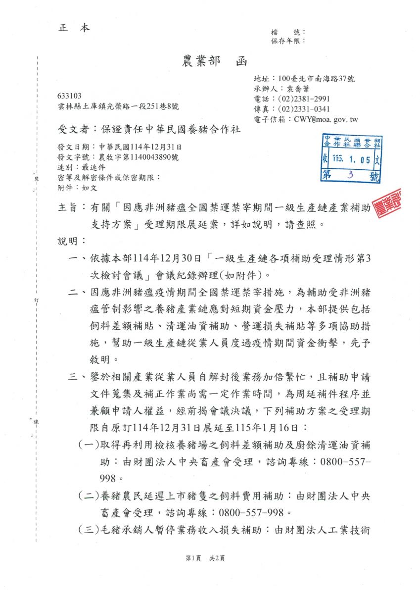 「因應非洲豬瘟全國禁運禁宰期間一級生產鏈產業補助支持方案」受理期限展延至115年1月16日