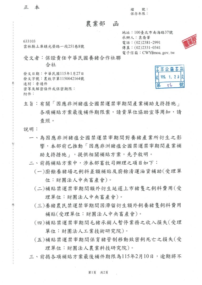 「因應非洲豬瘟全國禁運禁宰期間產業補助支持措施」各項補助方案最後補件期限至115年2月10日