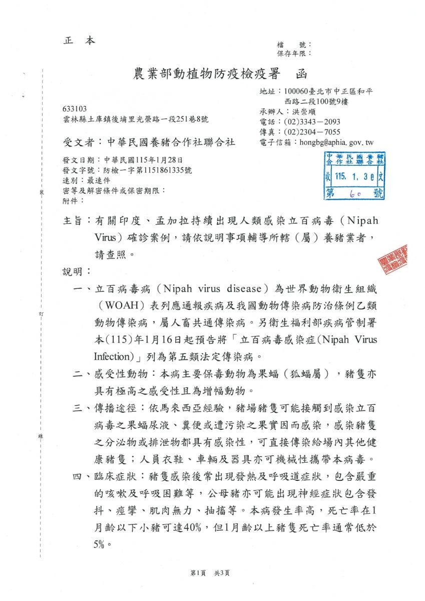 防檢署來函,有關印度及孟加拉持續出現人類感染立百病毒確診案例,請依說明加強辦理