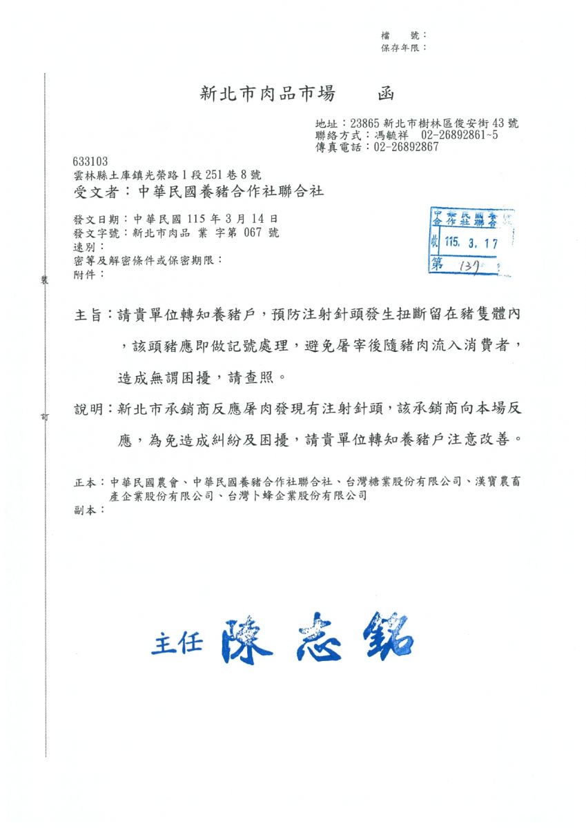 新北市肉品市場承銷業者反映,毛豬屠宰後屠體內發現有折斷針管殘留,請畜主注意改善