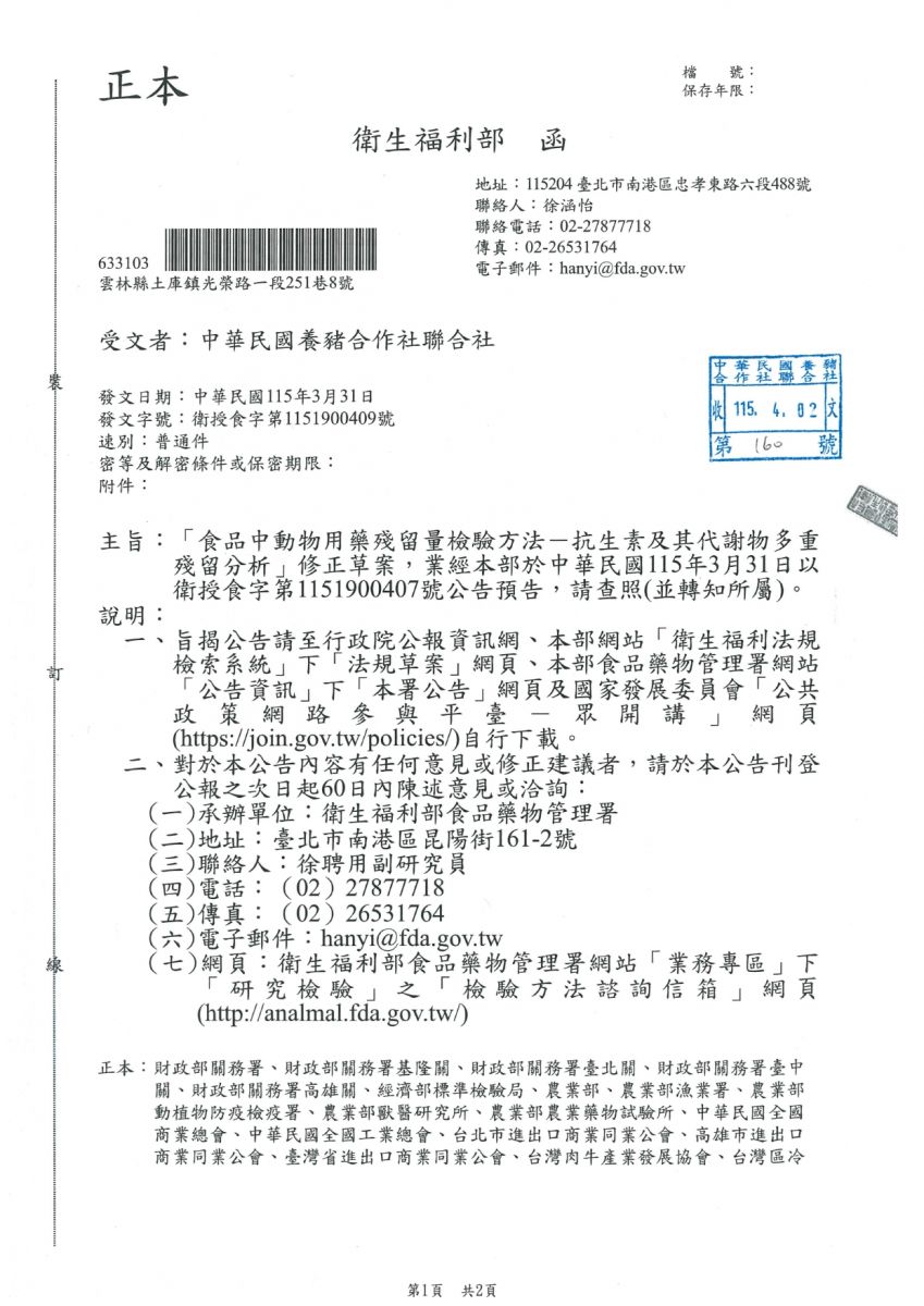 衛福部「食品中動物用藥殘留量檢驗方法-抗生素及其代謝物多重殘留分析」修正草案公告預告
