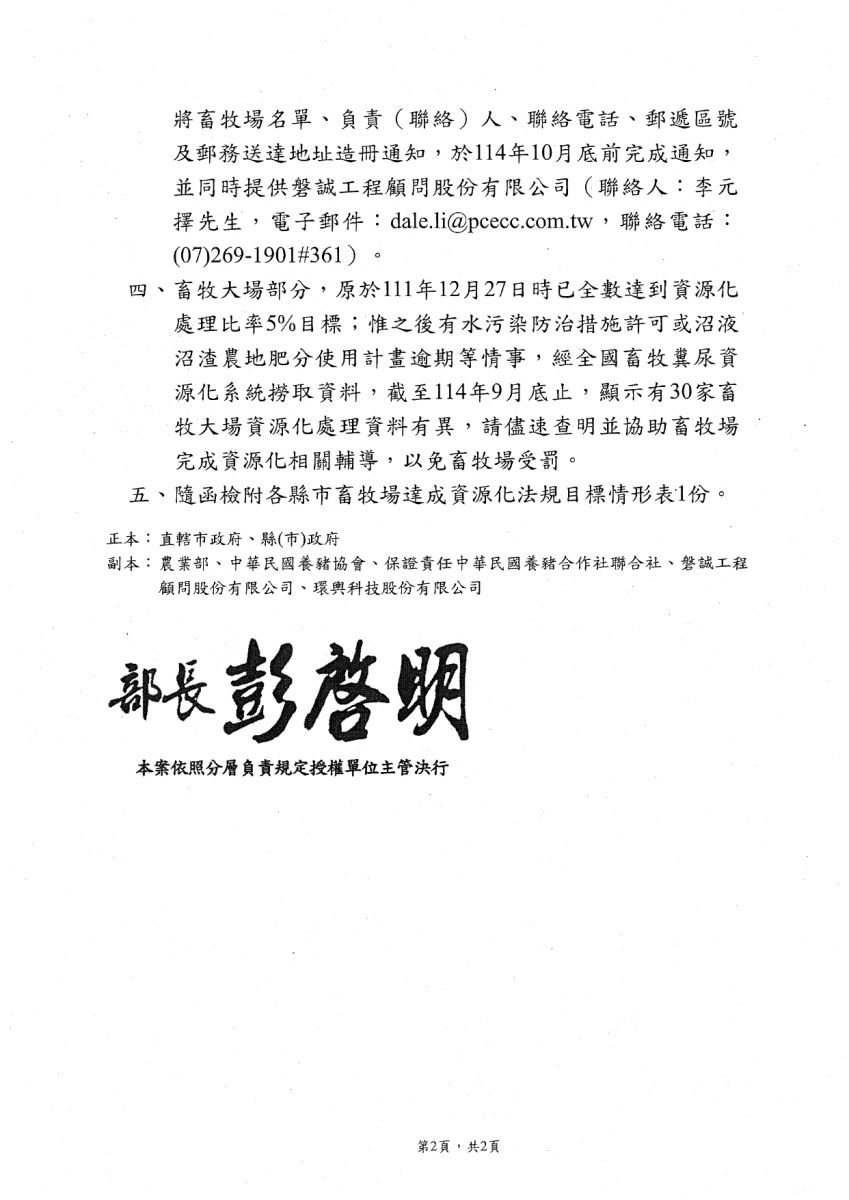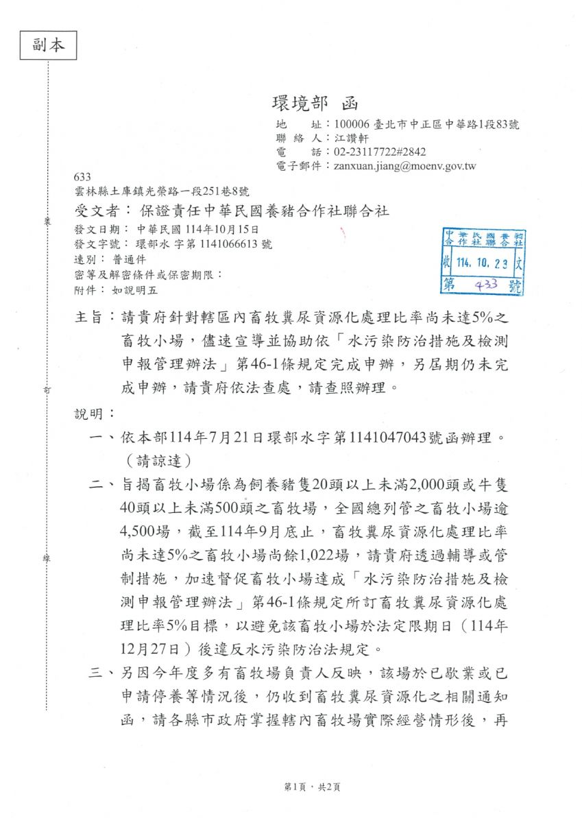 環境部來函,請畜牧糞尿資源化處理比率尚未達5%之畜牧小場,於114年12月27日前完成