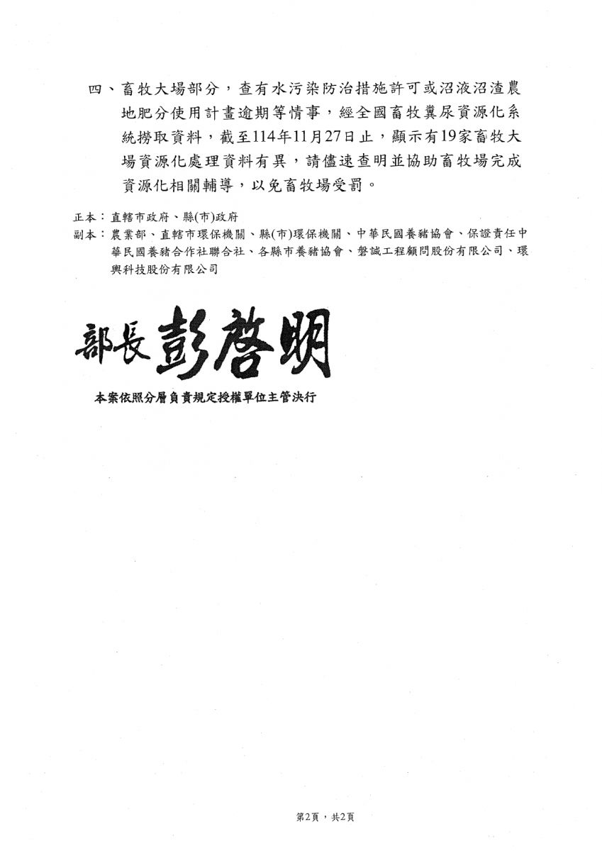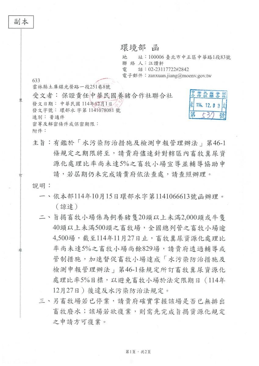 環境部來函,請畜牧糞尿資源化處理比率尚未達5%之畜牧小場,於114年12月27日前完成