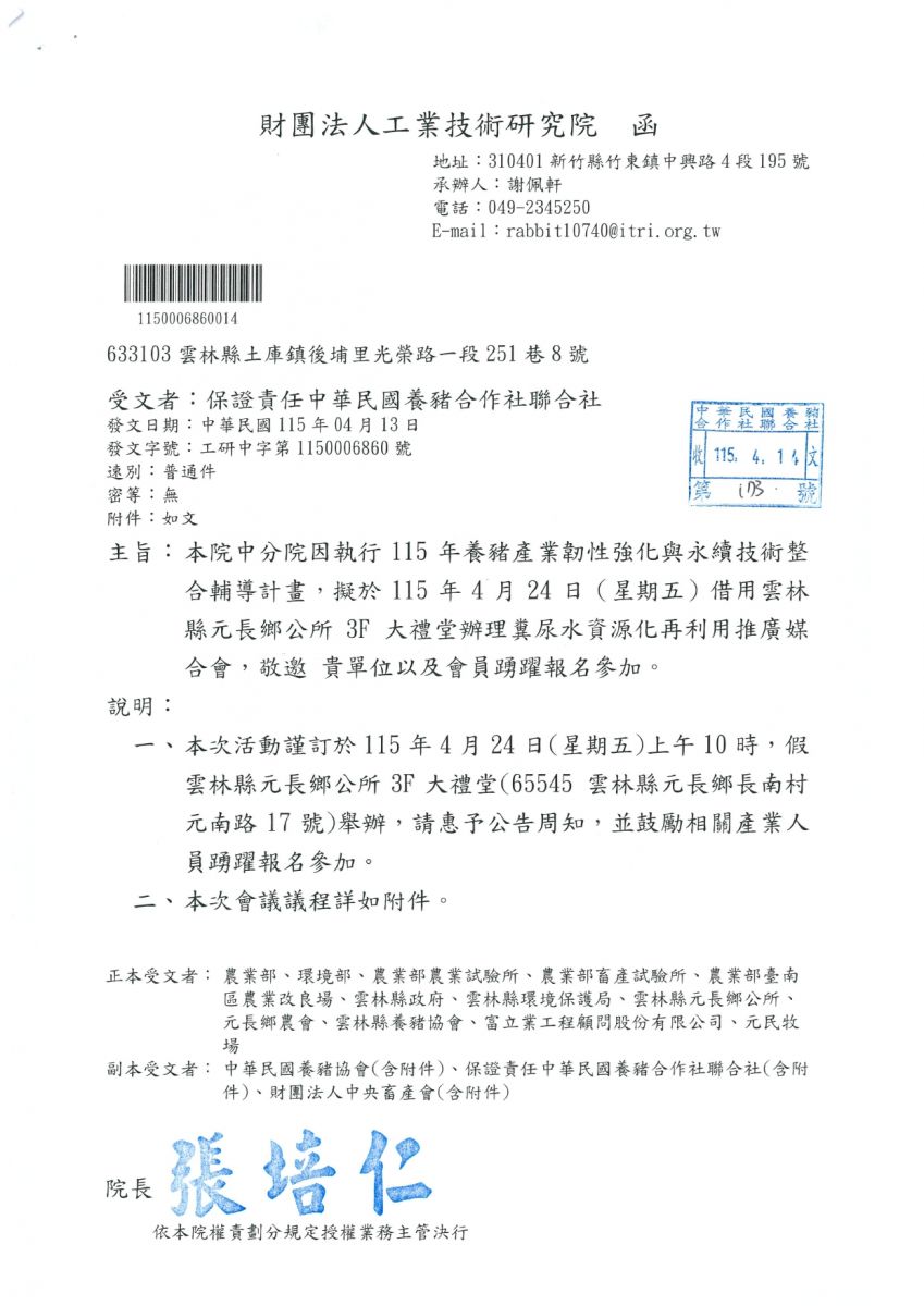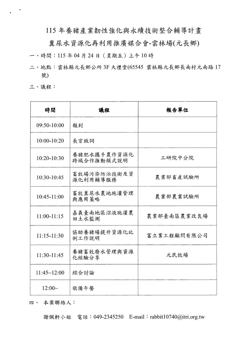 工研院於115年4月24日(五)舉辦 糞尿水資源化再利用推廣媒合會-雲林場 (元長鄉公所)