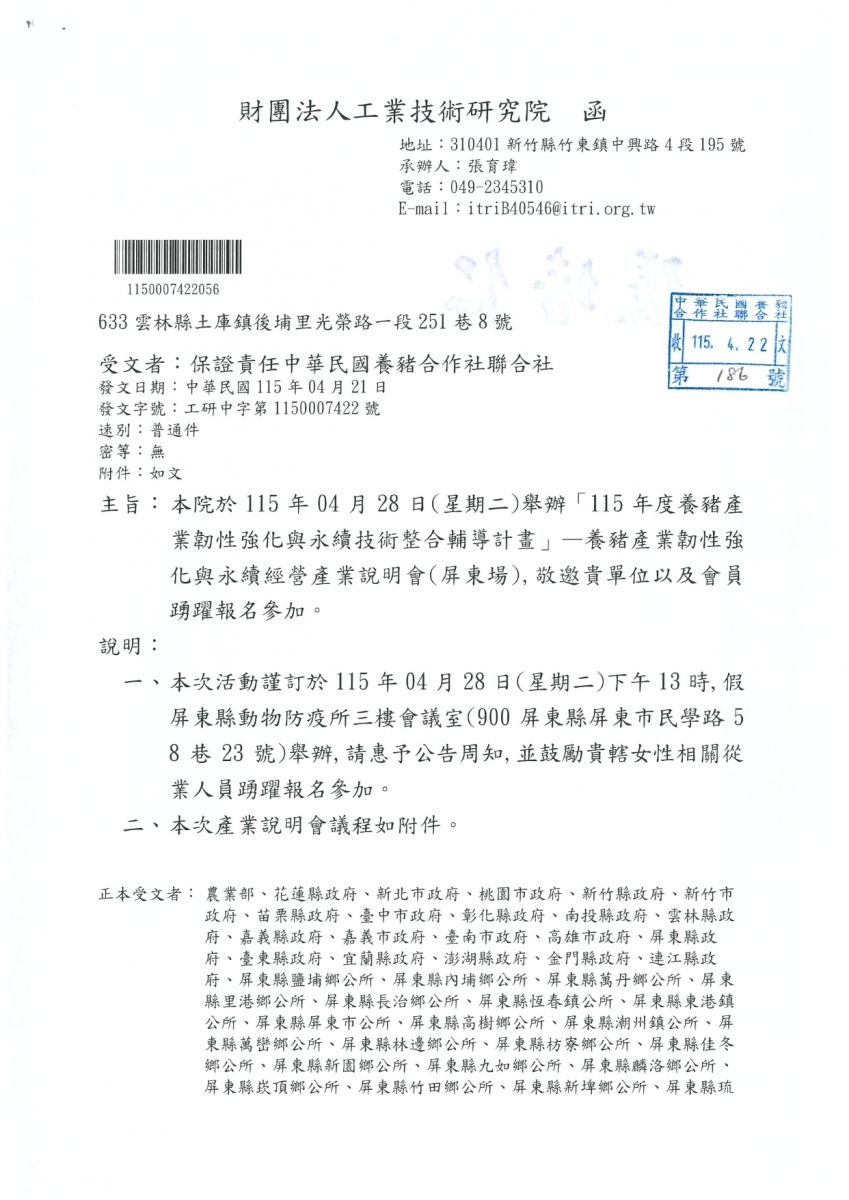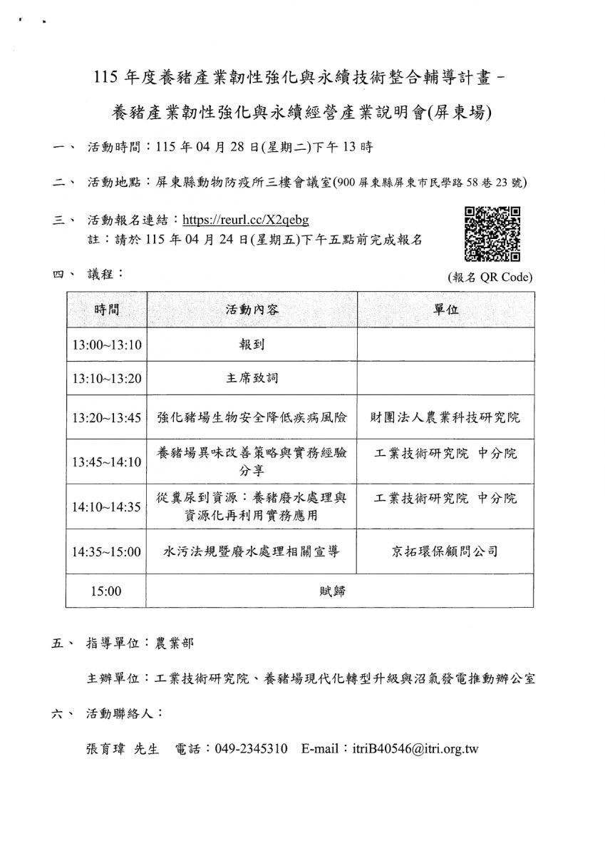 工研院於115年4月28日(二)舉辦 養豬產業韌性強化與永續經營產業說明會-屏東場