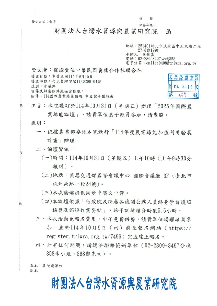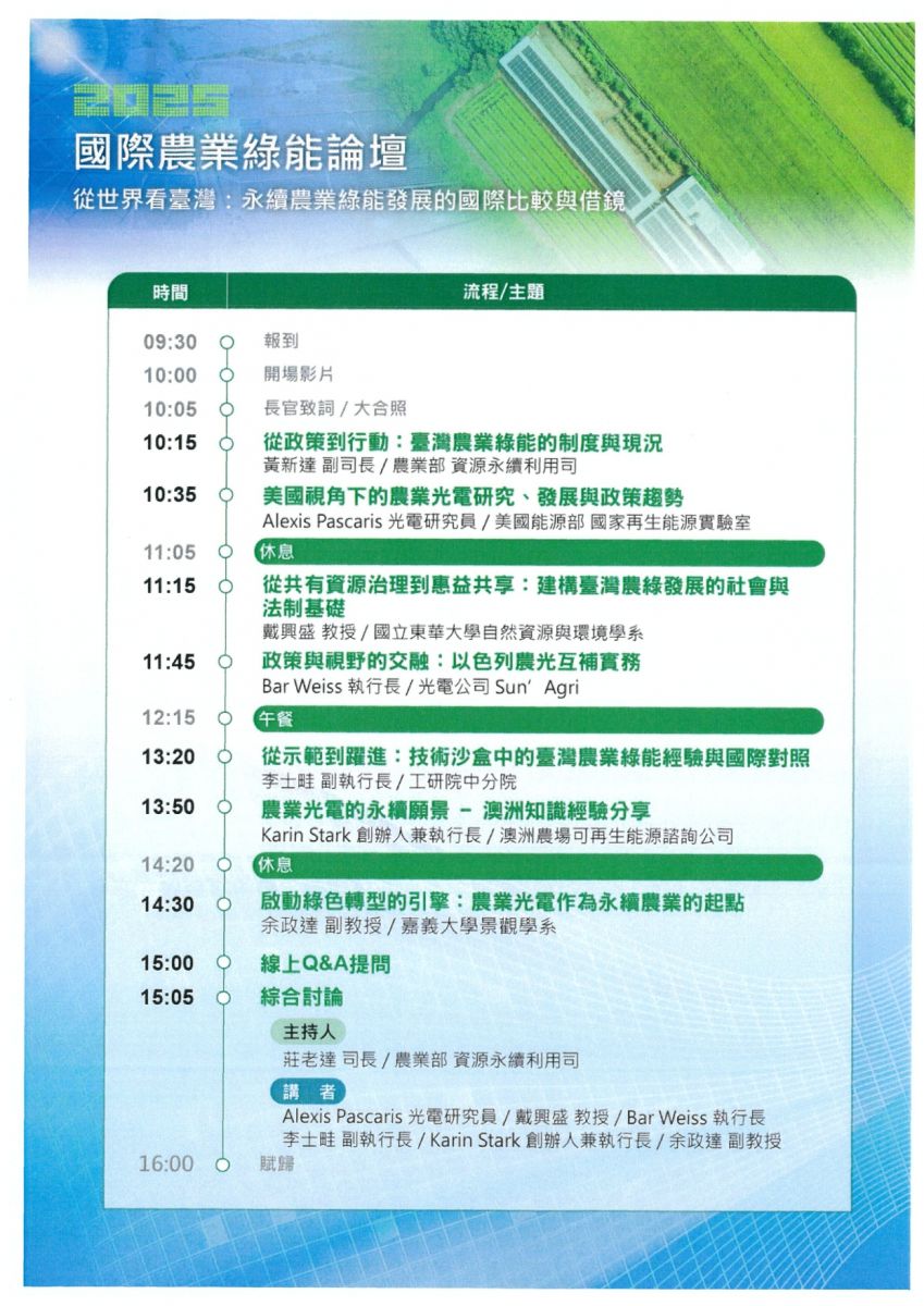財團法人台灣水資源與農業研究所訂於114年10月31日(五)辦理「2025年國際農業綠能論壇」